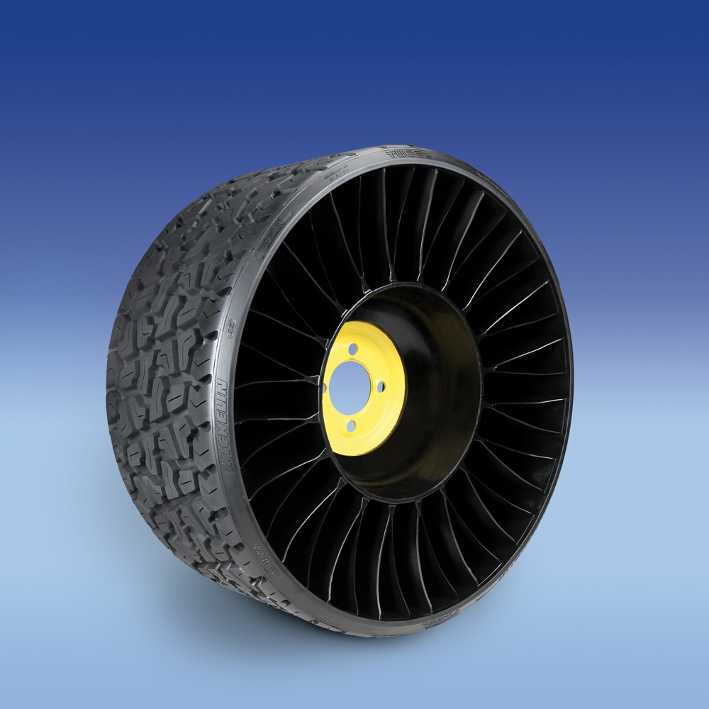 In 1995, engineers at the Michelin Technology Center in Greenville, S.C. envisioned a future where vehicles and machines would be able to be driven without experiencing a flat due to loss of air. When the engineers started working on this premise they were still designing a structure that looked like a regular pneumatic tire. What they discovered was that because they didn’t need to seal in the air pressure, they could change the configuration of the tire and, in doing so, the concept of the TWEEL® branded tire and wheel assembly was born. The TWEEL® product is comprised of a ridged hub, connected to a shear beam by means of flexible, deformable polyurethane spokes, all functioning as a single unit.