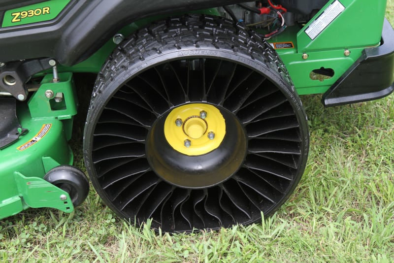 Launched in October 2014, the MICHELIN® X® TWEEL® TURF™, developed in collaboration with John Deere for use in commercial mowing, is available as original equipment to replace a standard 24x12x12 tire on the John Deere ZTRAK™ 900 Series line-up of zero-turn commercial mowers. The Michelin X TWEEL TURF is the first airless radial tire available and the first on any piece of mowing equipment, globally. The product has been demonstrated to last up to three times longer during all asphalt wear testing.