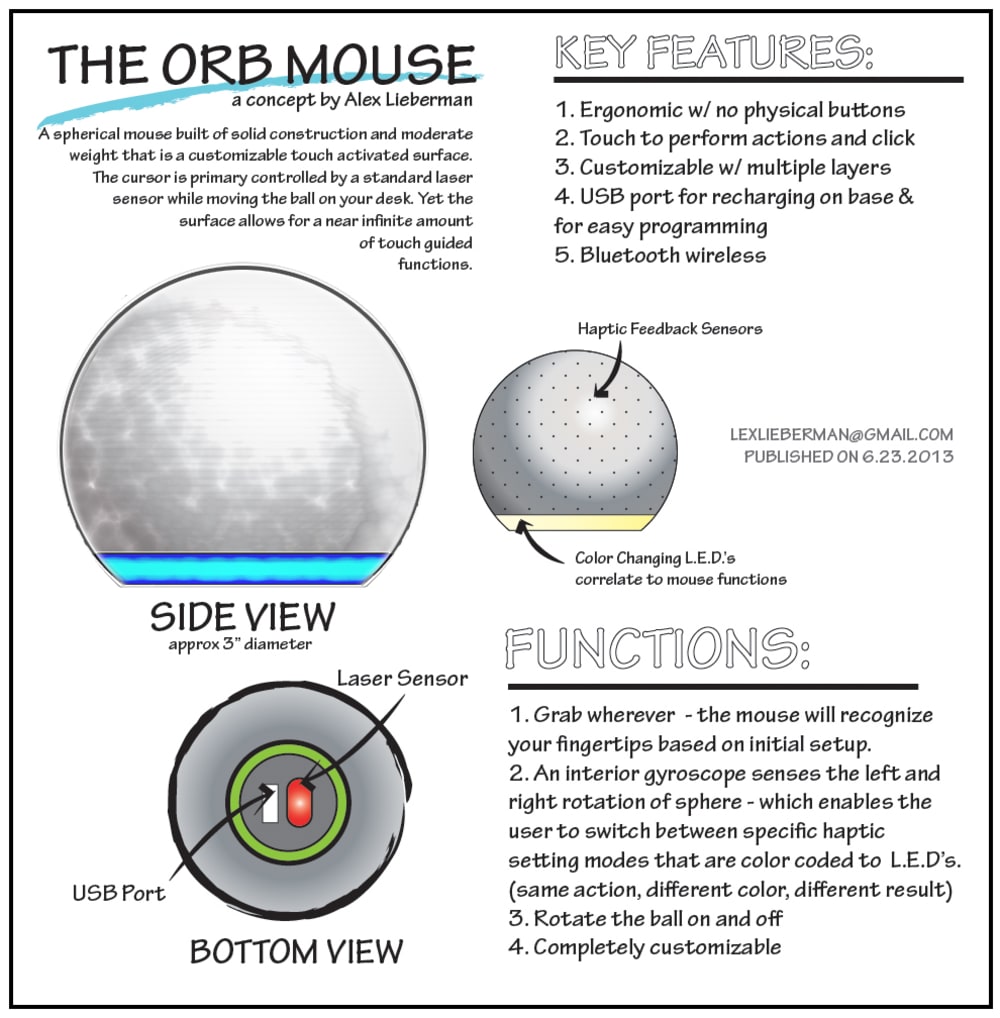 This concept is a spherical touch-surface mouse with multiple setting "layers" activated by rotation of an inner gyroscope sensor and designated with a specific color. It has no buttons or specific orientation and is a seamless curved touch surface. It senses your hand and automatically designates left and right clicks based on your thumb and palm placement as well as knowing which way is forward. It incorporates customized touch activities in conjunction with software.