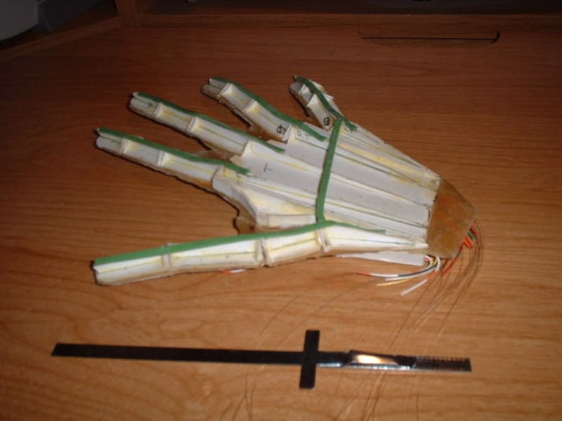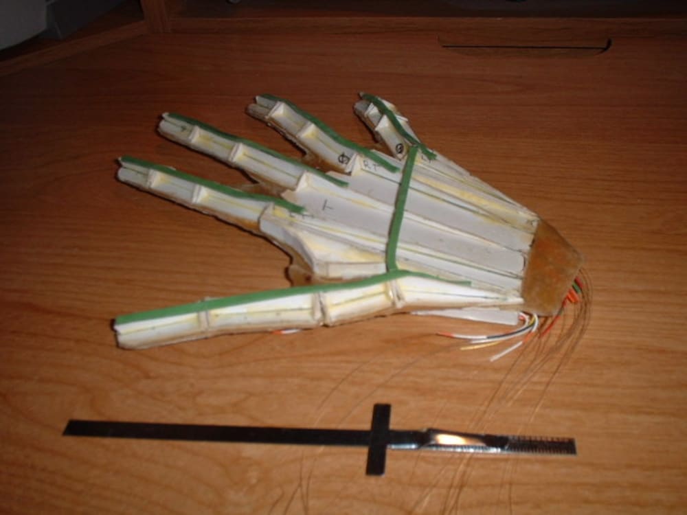 The hand voids are filled with 2 layers of rubber foam and a vulcanized latex cover to emulate the feel of a human hand. The cover also serves as the return springs.