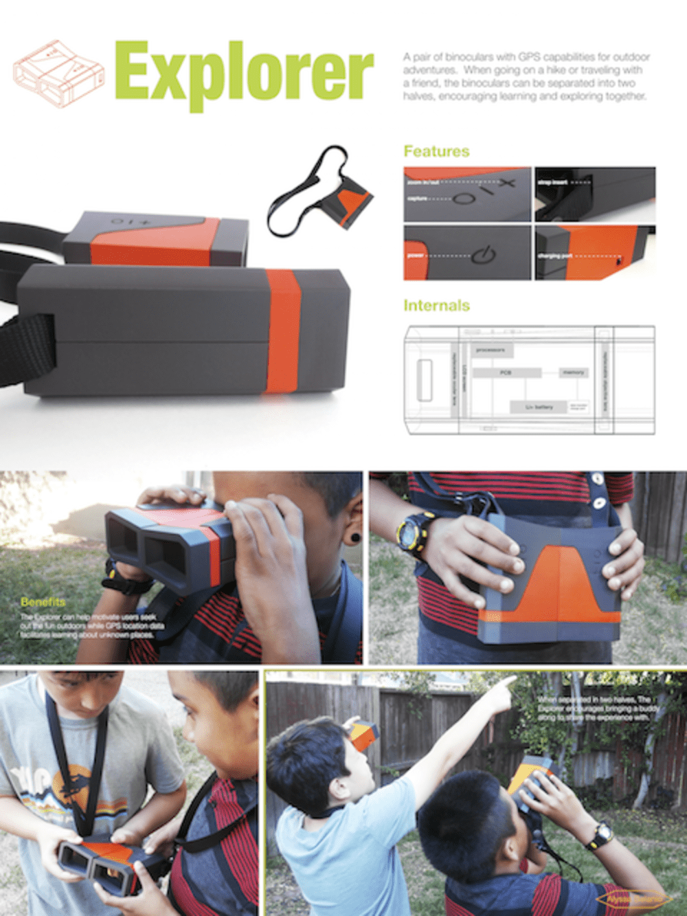 The Explorer is a pair of binoculars with GPS capabilities for outdoor adventures. When going on a hike or traveling with a friend, the binoculars can be separated into two halves, encouraging learning and exploring together.