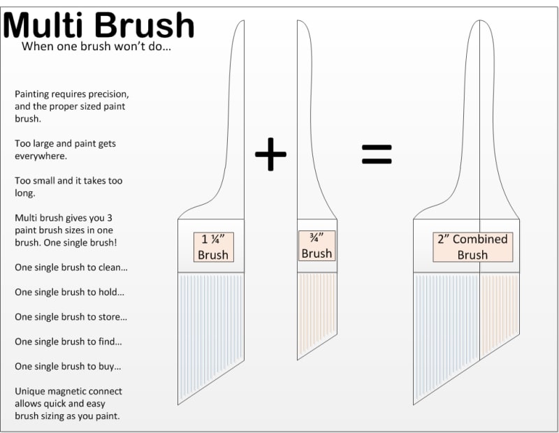 Imagine a paintbrush that could change sizes as needed while in the middle of a painting job. You just imagined the MultiBrush. The MultiBrush appears to be a normal 2" paintbrush, but when needed, it separates into 2 individual smaller brushes. A 3/4" and a 1 1/4" brush. Theses smaller brushes can be used to do the detail work, and when complete, effortlessly reattached using the patented magnetic technology back to the 2" configuration.