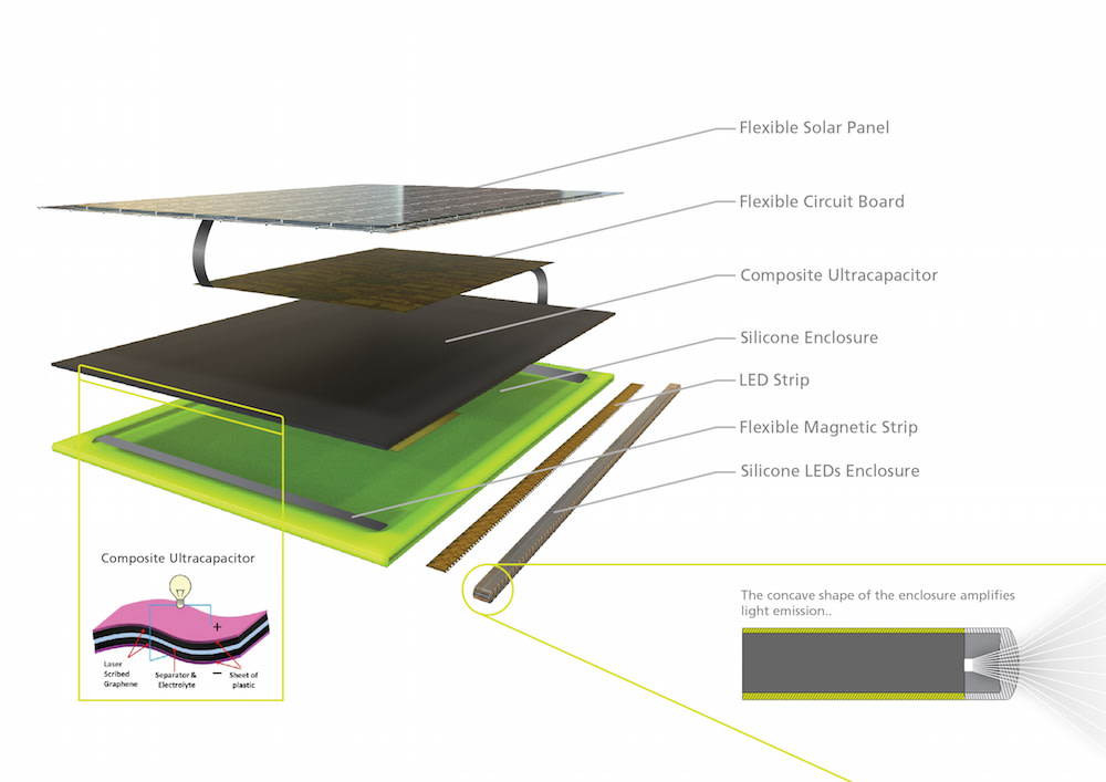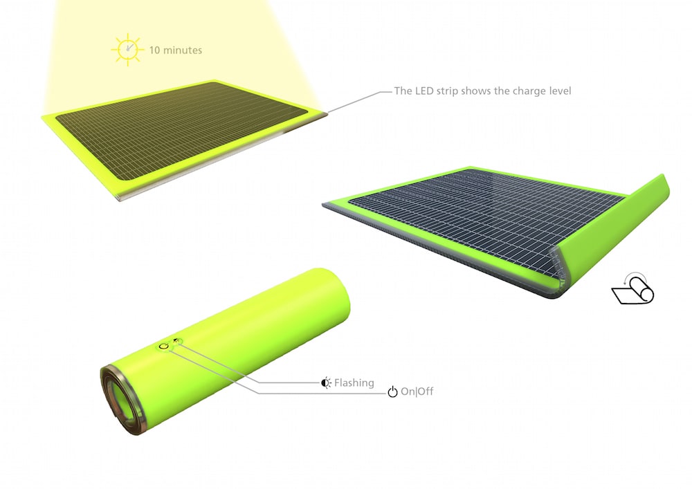 Flexolar is an ecological lantern intended for both indoor and outdoor environments. It is a design intended to reduce waste and pollution caused by chemical batteries. It uses sunlight as an energy source. It doesn't use batteries; instead it has a composite flexible ultracapacitor that has numerous thin layers of graphene and silicone.