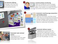 To help reduce these concerns, a new on-demand ordering system that also automatically loads and delivers meals and beverages to passengers is proposed. Under this new system, the item selection is made through the seat touchscreen and a centralized computer handles the orders and redistributes tasks to automated galleys. An automatic loading system replaces conventional galleys, while fountain drink dispensers using syrups and powders replace bottles and cans. These new galleys automatically prepare passenger orders and load small carts positioned below the overhead bins. These ABS-plastic carts are attached to longitudinal rails, powered by brushed DC motors, and located by RFID sensors. The three-level galleys are similar to existing automated pizza vending machines commercialized by Let’s Pizza. Items move between levels using lifting and conveyor plates operated by pistons. Once the cart reaches the targeted seat, aluminum telescopic arms powered by stepper motors deliver the order to the passenger. While the software and the human-machine interface were developed in Java to optimize the system configuration, the delivery system was designed in Catia and 3D printed.