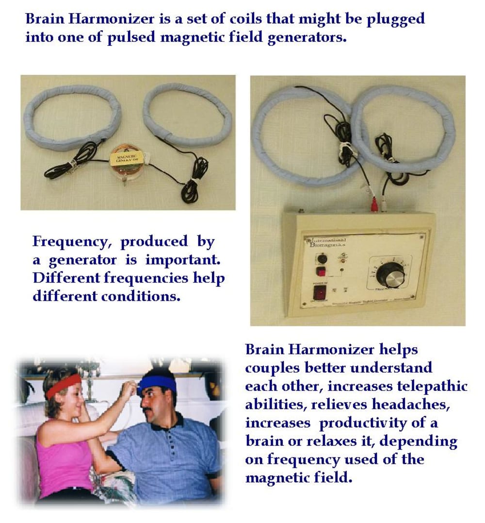 The brain harmonizer is a coil that might be plugged into several types of pulsed magnetic field generators. The simplest form of brain harmonizer consists of a coil large enough to go around the head and is powered by a blinking LED triggering a MOSFET. A nine volt battery supplies the current. The frequency produced by a generator is important. Different frequencies help different conditions. Alpha waves (eight cycles), or any other frequency, can be introduced to the brain. For enhanced telepathic communication a frequency of one or two HZ is used to provide a background frequency. Since such extremely low frequencies appear not to be used by the brain, they don’t interfere with other brain activity, but are more like a drum beat which serves as background for a dance so that dancers can keep a steady rhythm while improvising their own variations.