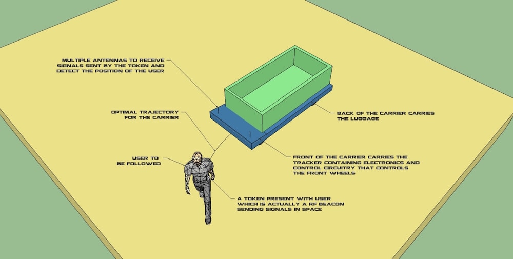 The idea is to create a technology that can be added to unintelligent movable products transforming them into intelligent user following devices. This will make the task of transportation a lot easier. This technology can be added to your travel bags so that they automatically follow you whenever you are on the airport. Similarly, the technology can be added to shopping carts which will be able to follow you while you roam around picking up grocery items.