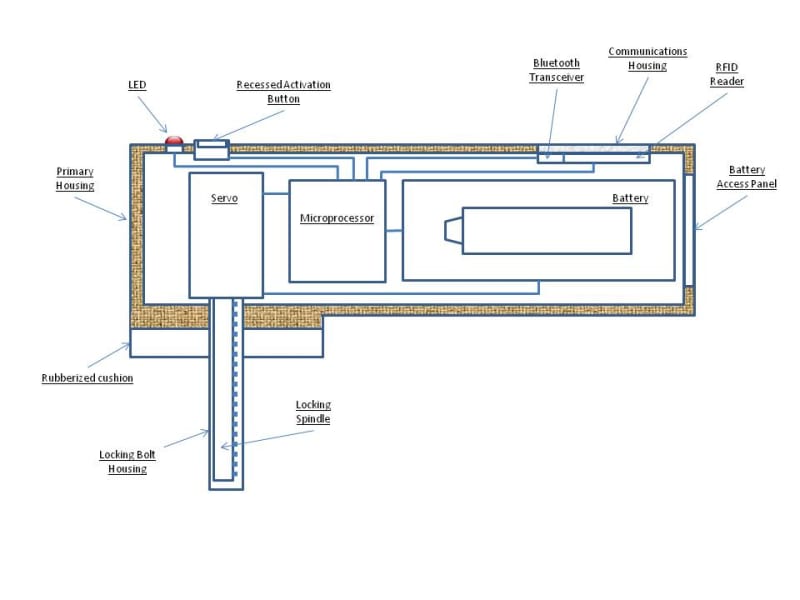 Redilock uses low energy Bluetooth 4.0 to unlock other nearby Redilocks, making several firearms available at the press of a button. Redilock is designed to meet California requirements for firearm safety devices. The design allows users to operate the lock using either hand. The battery and servo are positioned to lie along the length of the firearm, providing a low profile for secure storage in tight spaces such as drawers and handbags. Lithium batteries and power management should allow over a year of use between battery changes.