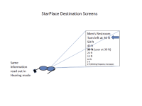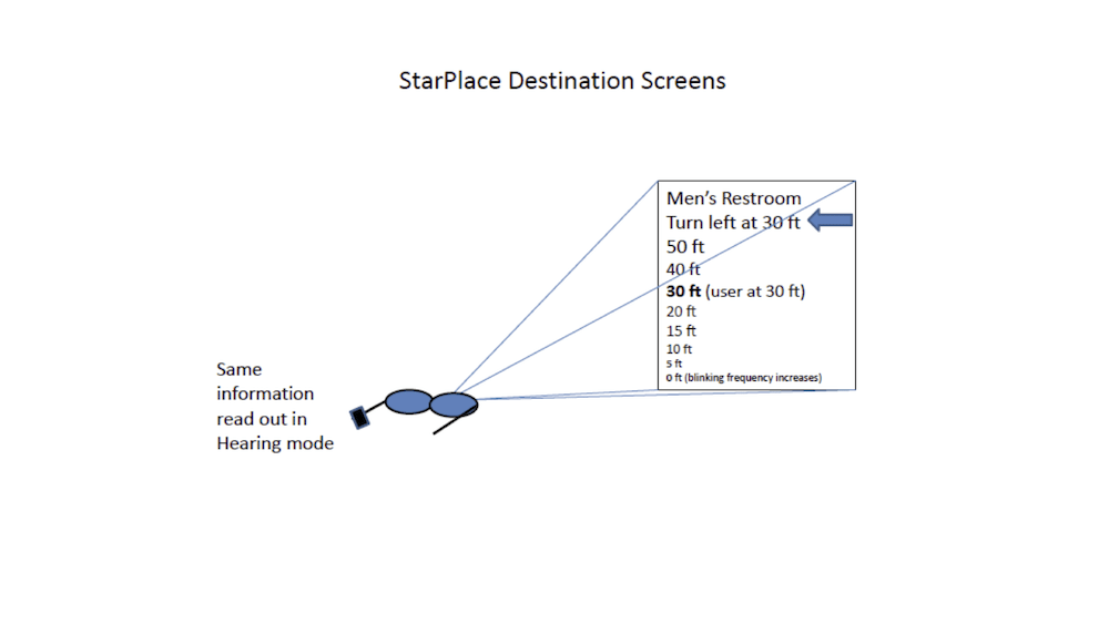 For both modes, a Pointer gives directions via earpiece and on screen, triangulating the orientation of the user referenced to North and basing a change in direction via AG or mobile device accelerometers already incorporated. Access to specific Destination is via taps on the AG or touch on computing device to scroll through Destinations; Each Destination would enunciate itself, for example, “Men’s Restroom – twenty feet, fifteen feet, etc,” a voice countdown for Hearing mode and visual countdown for Visual mode. Either mode could be enabled to automatically enunciate all Destinations, or groups such as restrooms, emergency exits, etc, or to exclude some.