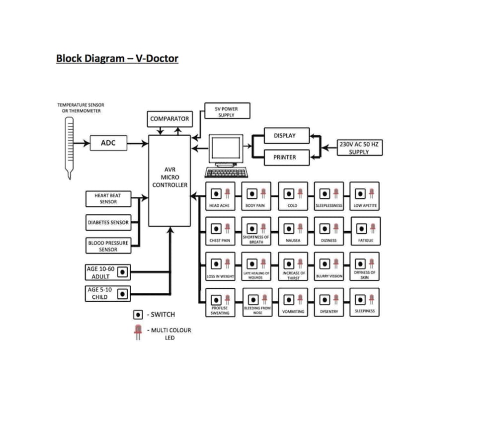 In order to reduce the human effort in treating and diagnosing of diseases, a virtual environment called V-Doctor is created which checks for diseases and prescribes medicines accordingly. The main aim of the project is to offer medical services to people in urban areas across the country at free of cost. The process is that, when the determined output value from the sensors is different from the predefined value, the computer acknowledges it as an abnormal value or a disease and offers treatment (i.e.) it prescribes medicines. Here the computer acts as the medical practitioner which is capable of finding out disease. We use AVR controller to process the data, various bio medical sensors like Blood pressure sensor, diabetes sensor and temperature sensor are used to gather the sample from the patients. A software program using visual basic and C program to print the medicines prescribed.