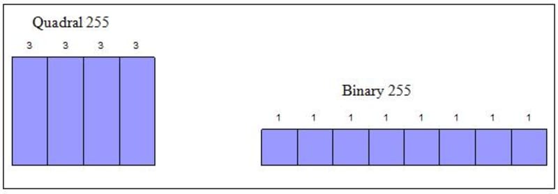 In quintal system only 4 numbers of data segments is required for representing numbers up to 256 but in binary system 8 segments are required. Thus same space (number of transistors) can process more data in quintal system than binary system (number of data processed by binary raised to the power of two using same frequency). Only amount of setting voltage of gates is different.