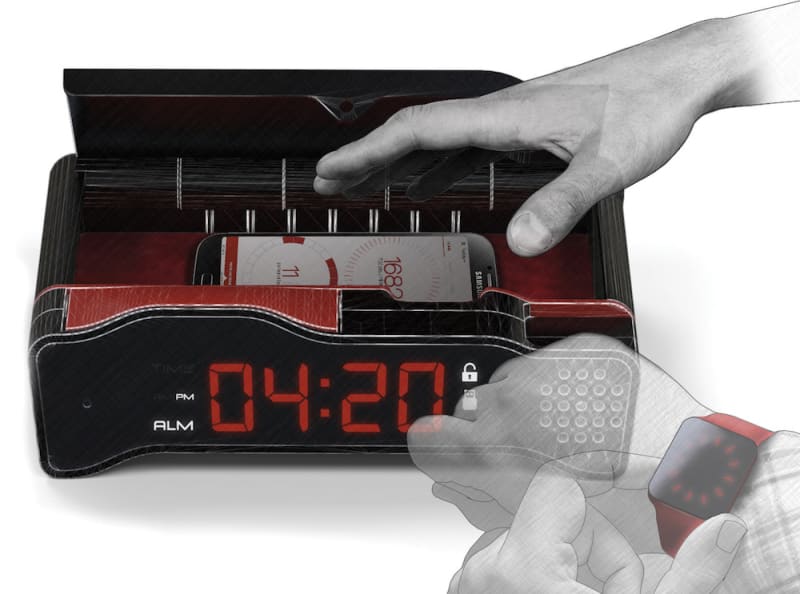 In order to stop people using their phone unnecessarily before bed, it will be locked away in the phone cell and cannot be removed. To prevent people automatically depending on their phones in the morning, the user will place their phone into the Phone Cell which will electronically lock when the device is connected and closed. In the morning, in order for the user to be reunited with their phone, they must wear the Cell Key (with either; the wrist strap, magnetic clip, or a lone module) and take 20 steps (approximately). This gives the user time to carry out their morning routine (i.e. go downstairs, brush teeth, have a shower etc). Upon returning, 20 steps would be completed, allowing the user to wirelessly contact the Cell which will connect via NFC. If the user has completed their 20 steps, the Cell will detect this and unlock the phone.