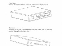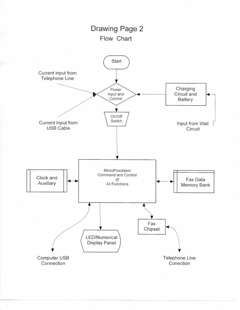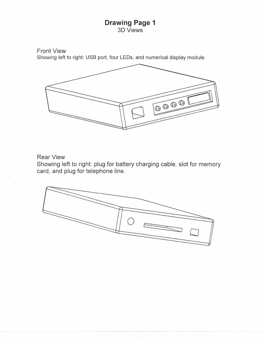 The device is appx. 3 x 5 x 0.75 inches in size. Connections are a standard modular RJ1l type plug in the rear to connect to the telephone line and a USB plug in the front to connect to a computer. The sending and receiving of faxes is powered by the standard telephone line current. A lithium ion battery, such as is used in small digital cameras, is included for powering of status lights, etc., when the unit is not connected to the telephone line or to the computer. This battery is charged by a standard charging unit through a plug in the rear of the unit and will hold enough current to maintain idling function over a period of months.
