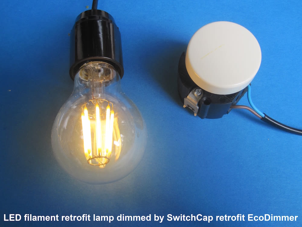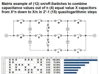 With increasing lamp brightness another handicap becomes apparent: missing dimmability of driverless LED retrofit lamps by means of conventionally installed phase-cut dimmers. However there is a solution to the problem – even increasing efficiency, longevity and light quality versus conventional approaches, deteriorating efficiency, which is a practically lossless capacitive retrofit step dimmer. Acceptable step resolution however would require a lot of foil capacitors with various fine-tuned non-standard capacitance values, which would not fit inside a standard switch box to replace the installed conventional dimmer or a light switch. One approach to overcome this density challenge would be to use a standard binary coded rotary switch selecting combinations of e.g. 4 capacitors to come out with 15 capacitance values in linear steps but as LEDs become ever more efficient the less current is forced upon them as a reverse effect of the efficiency droop phenomenon – in contrast to incandescent lamps – (http://spectrum.ieee.org/semiconductors/optoelectronics/the-leds-dark-secret) linear steps turn out to be less suitable rather than logarithmic steps and on top of that exact half or double values are not available as affordable standard high voltage foil capacitors. The alternative would be to combine n capacitors of the same capacitance value X in 2^n-1 logarithmic steps from X*n down to X/n by means of a pretty complex matrix switch which could be cheap in mass production but extremely expensive in providing appropriate precision tooling. However this proprietary switching principle would also allow to combine a higher number of smaller capacitors to make an increased logarithmic step resolution physiologically non-recognizable as a step function when replacing conventional dimmers to achieve various advantages.