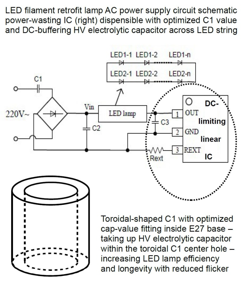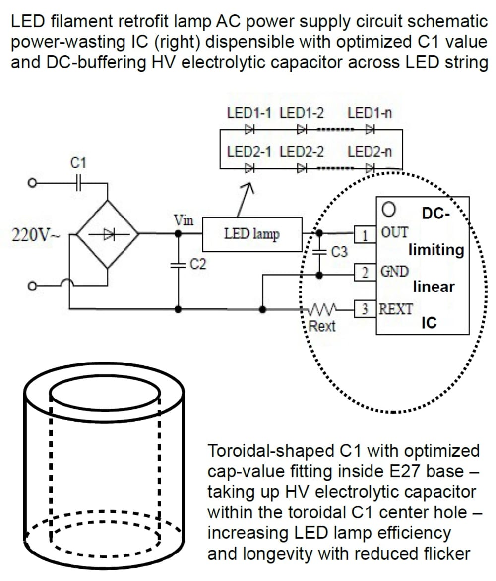 Incandescent light bulbs are facing bans because they are a waste of energy and material due to extremely inferior efficiency and longevity. LED retrofit lamps seem to be the best choice and the new breed of LED-filament retrofit lamps with outstanding efficiency and omnidirectional light distribution obviously are the next best replacement of the Edison light bulb with the closest look and feel. Those are replacing 40 Watt incandescent light bulbs with just 4 Watt power consumption. However the DC-limiting linear IC within the E27 base still wastes approximately 20% of the power input, heating up the base and thus limiting the lifetime of the adjacent electrolytic buffer capacitor. Going beyond 4 Watt, losses grow worse: the 8 Watt version, supposed to replace the most-used 60 Watt incandescent light bulb, is increasing the portion of heating-wasted power just lasts for one month permanent operation. It could last for years if the DC-limiting IC could be replaced by a losslessly AC-limiting high voltage foil capacitor below 1 µF. Unfortunately both capacitors (the high voltage electrolytic buffer capacitor and the high voltage foil capacitor) would not fit inside the narrow E27 base side by side but if the foil capacitor was of a (manufacturing-proven) toroidal shape it could take up the electrolytic capacitor in it's center hole without heating it up and still leaving enough headroom within the E27 base for even much brighter lamps.