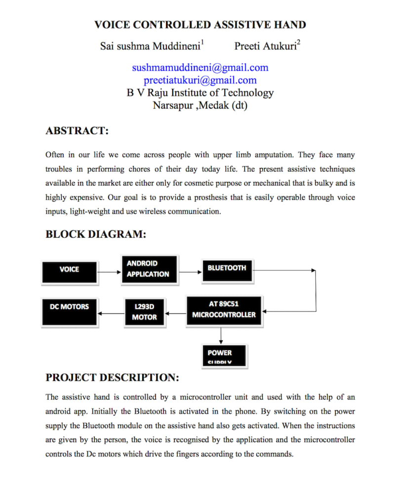 The assistive hand is controlled by a microcontroller unit and used with the help of an android app. Initially the Bluetooth is activated in the phone. By switching on the power supply the Bluetooth module on the assistive hand also gets activated. When the instructions are given by the person, the voice is recognised by the application and the microcontroller controls the servo motors which drive the fingers according to the commands.