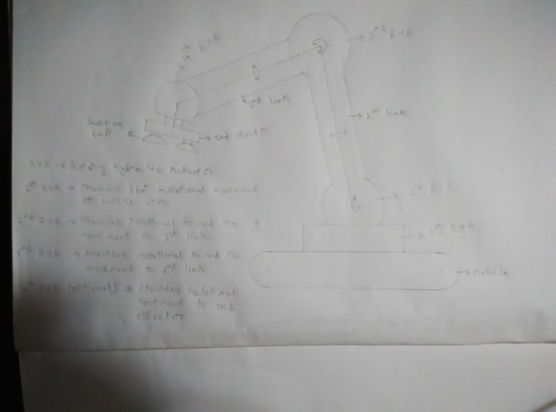 4. For now we are just developing the arm keeping a suction cup / suction cups as the end effecter. We intend to develop the end effecter area of our arm once we have achieved fruitful results in the hydraulics and mobility areas of the robotic arm.