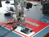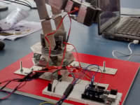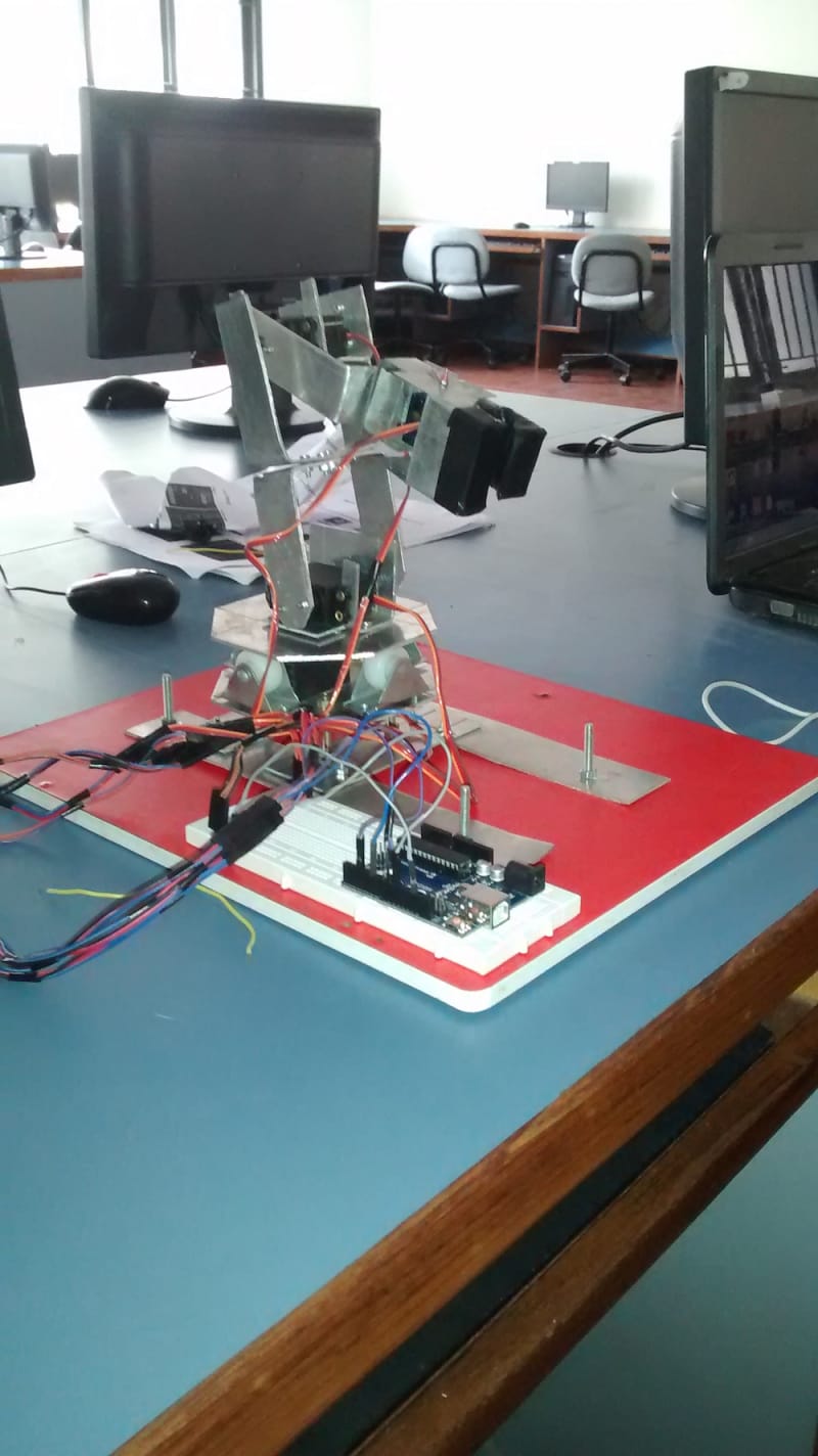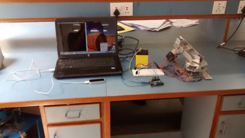 The main objective of this work was to design, develop and implement a competitively robot arm with enhanced control and stumpy cost. The robot arm was designed with four degrees of freedom and talented to accomplish accurately simple tasks, such as light material handling, which will be integrated into a mobile platform that serves as an assistant for industrial workforce. The robot arm is equipped with several servo motors which do links between arms and perform arm movements. The robotic arm is operated & controlled wirelessly with the help of hand gestures, which transmits signals to the robotic arm through leap motion device rather than controlling it manually through a conventional remote controller. It communicates with the system using node.js software and, which performs inverse kinematic calculations and communicates the proper angles serially to a microcontroller that drives the servo motors with the capability of modifying position, speed and acceleration.