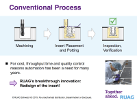 RUAG’s breakthrough innovation involves the insert itself, the process and a newly developed machine called the RUAG Automated Potting Machine (APM). The machine shapes the panel, drills the insert holes, applies the adhesive to the insert, places the insert into the panel and produces a final test report summarizing the relevant process parameters for each single insert. These activities were previously all done in individual steps on different machines in different locations involving a high amount of manual labor.