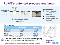 With a revolutionary new and patent pending insert, RUAG Space has been able to automate the process of insert placement into composite sandwich panels for satellites. As a result manufacturing time and costs can be reduced significantly. Apart from the above, the new process requires less potting compound to glue the insert into the panel resulting in less launch mass.