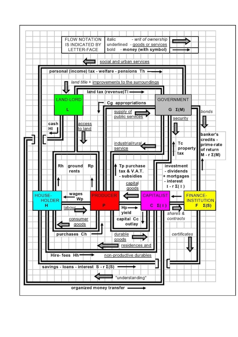 These individual kinds of entities have incoming and out-going money flows, and from Nobel Laureate W.W. Leontief's input/output money-flow theory, each entity balances its rate of money passage (see "The Choice of Technology", Scientific American, Vol.252, no.6, June, 1985). The money is always spent, loaned, invested, etc., rather than it being hoarded, which has no economic advantage. A diagram illustrating this situation is presented in Figure 1.