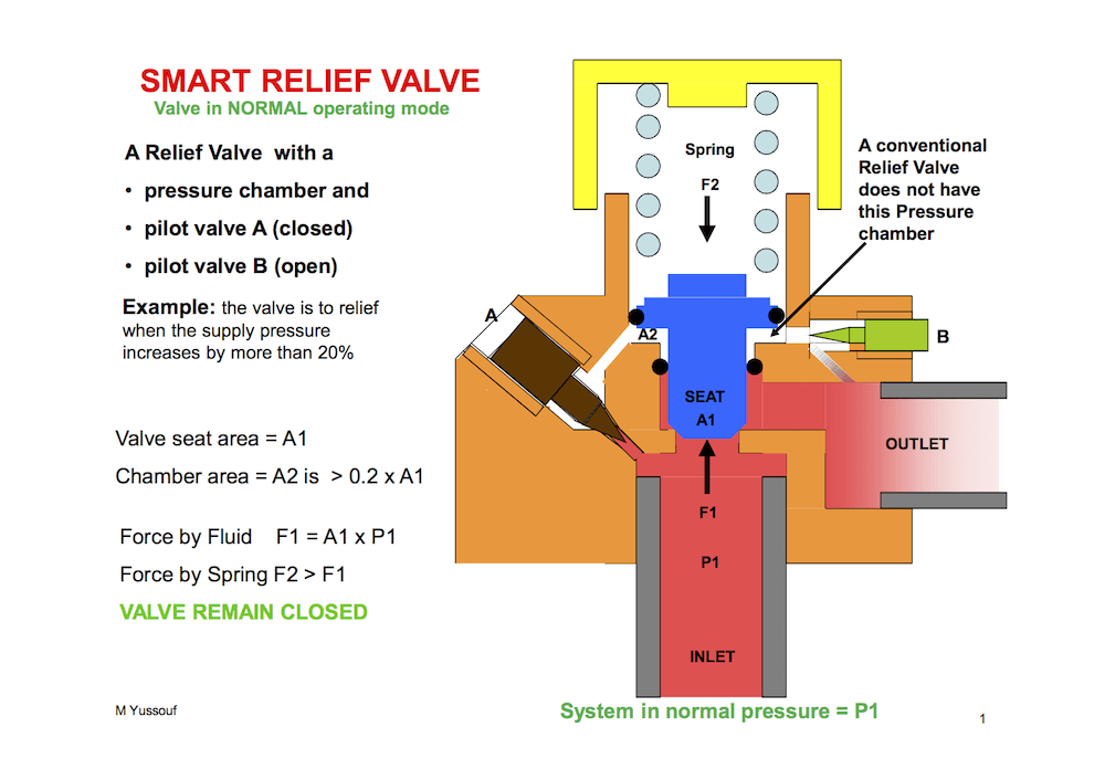 Innovation: In traditional relief valve the valve seat pressure area is fixed; the varying fluid pressure is used to open the valve. The Smart Relief Valve has a built-in separate pressure chamber. When the same or even less fluid pressure is applied in the chamber, it exerts enough force to compress the spring and to open the valve.