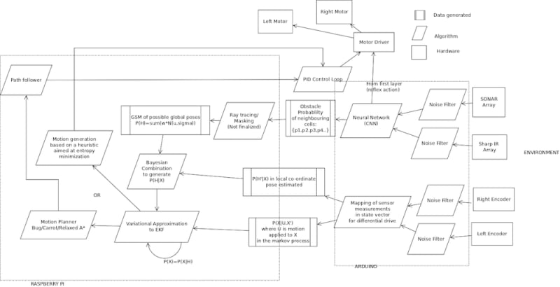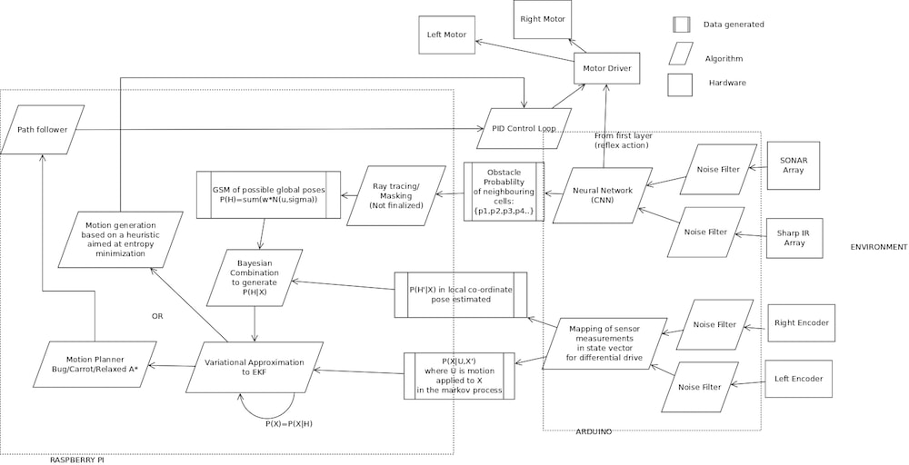 > SONAR and highly accurate odometry based localization: To bring down the cost of our design, we could not use any LIDARs or depth sensors like Kinect for gaining information about the environment. So, we had to resort to SONARs only but SONARs are very inaccurate, have low range and is susceptible to a lot of noise. To overcome all these, we developed a SONAR profiling algorithm based on Machine Learning techniques to increase its accuracy.