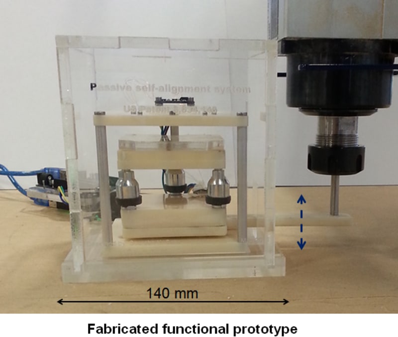 We have broken the tradeoff by abandoning the conventional design paradigm that relies on feedback motion control. Instead, we have developed an alternate strategy wherein alignment is achieved via kinematics, i.e., by forcing the surfaces to move along deterministic paths that are enforced by physical geometric constraints. This strategy (i) eliminates expensive sensors, (ii) reduces the number of actuators by a factor of 3, and (iii) enables using low-performance actuators to achieve the same alignment. In combination, these factors reduce the cost by at least 100 times without sacrificing alignment accuracy.