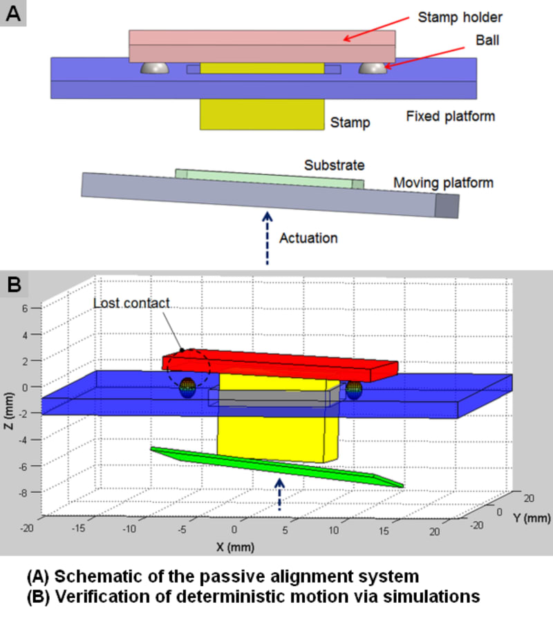 In this system, kinematic constraints are implemented by supporting the stamp on a set of three smooth spherical balls. When the misaligned bottom surface is moved up towards the stamp, the stamp first loses contact with one ball and gradually comes into contact with the substrate along an edge. With further actuation, the stamp loses contact with the second ball and then the third ball, whereby the stamp then “sits” entirely on top of the substrate. As the alignment process is decoupled from the contact force, fragile features can be imprinted by independently tuning the contact force to infinitesimally small values.