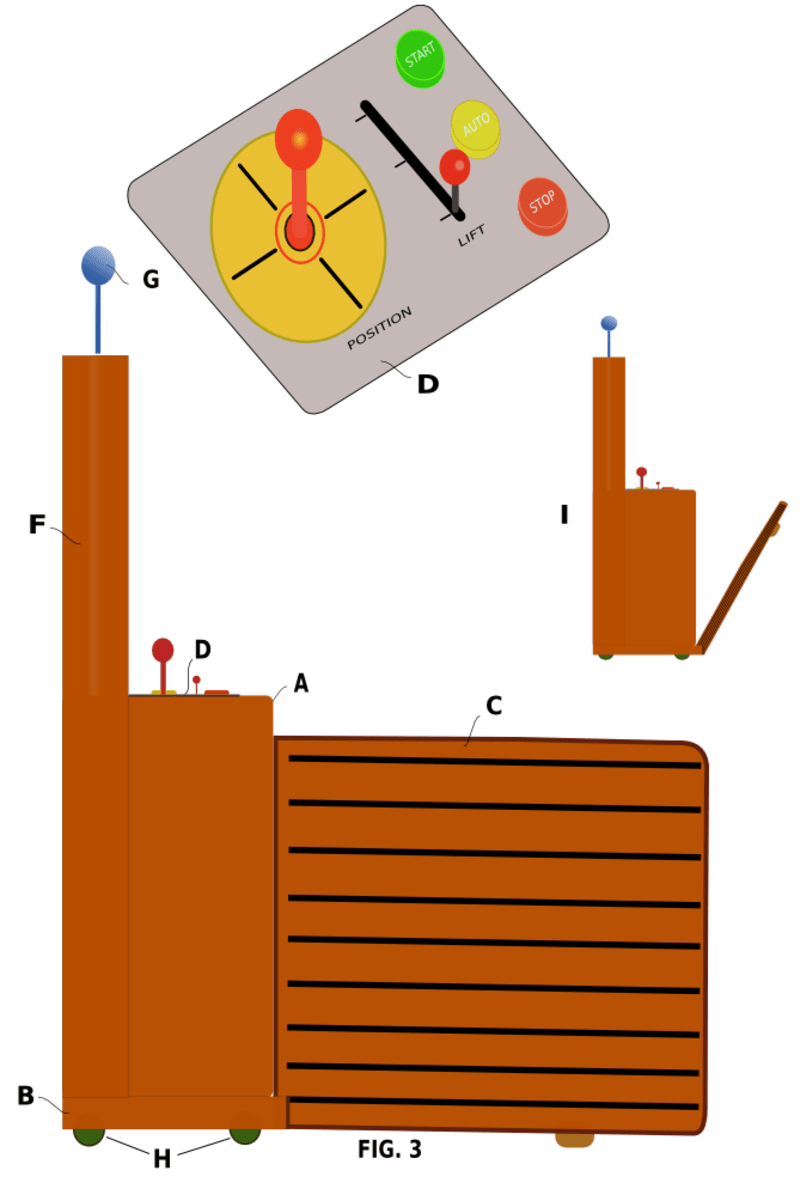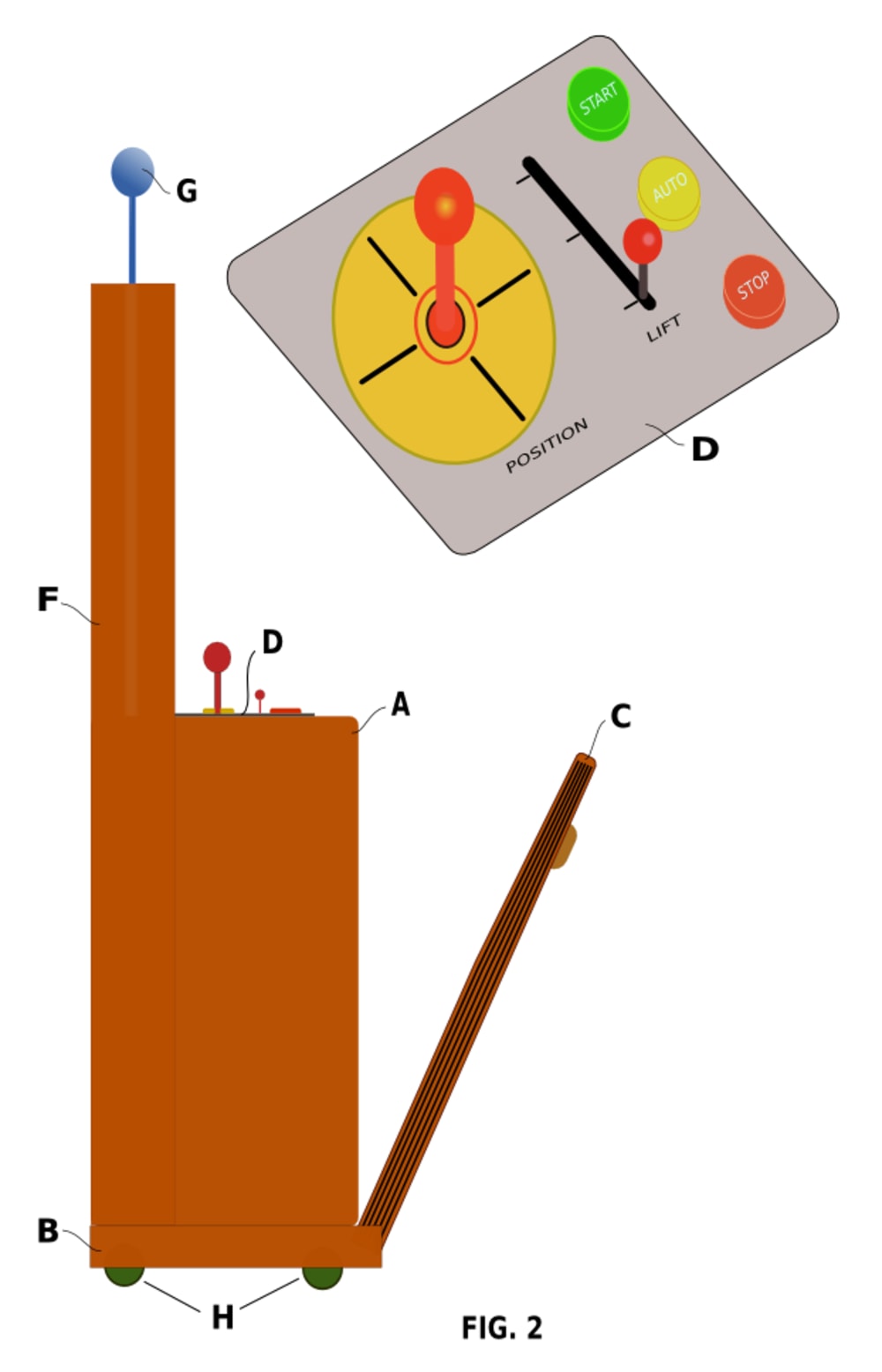 - Console with joystick for positioning machine manually, lever for activating body lift, and status indicators.