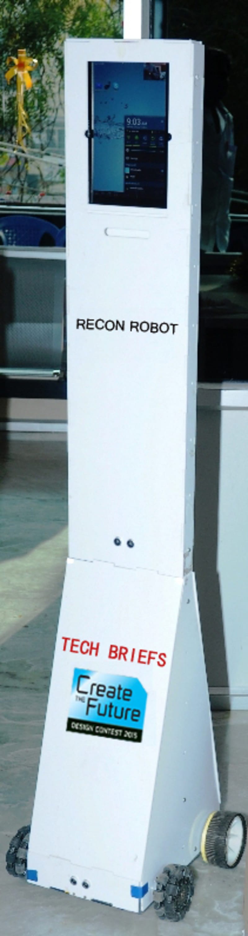 Recon Robot has a head pit designed to hold a tablet or a phone which helps in receiving the commands from the user who is located at a faraway place (anywhere around the world). Commands can be received/transmitted from the user end android device to the robot end android device through “Data connection/ Wi-Fi/ Bluetooth/ DTMF” whereas “Data connection” has the greatest advantage over range. Shaving of extra elements like self balancing, environment monitoring, health monitoring, IP cam, autonomous movement restrains the stress on the battery and gives extra life to the bot. Avoid of these elements makes this bot economical. Firm and slim design of Recon robot balances it well and Auto CAD design helps in easy manufacture of individual parts of the robot. Video streaming eases the navigation.