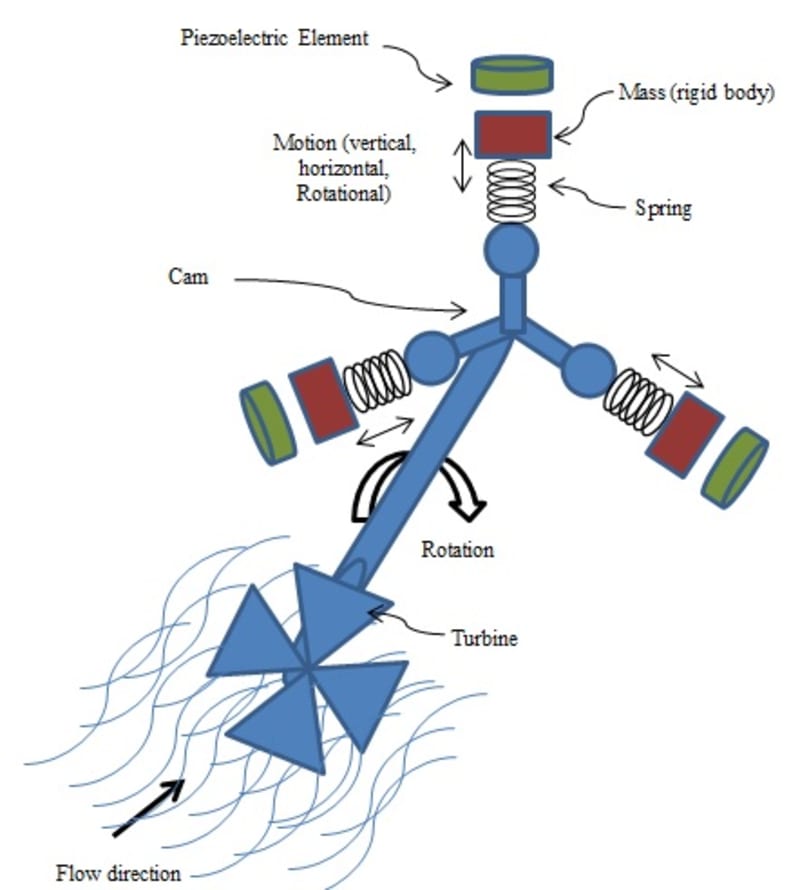 This generator consists of multiple piezoelectric generators which are activated by a cam mechanism. Cam rotation causes the compression of the helical spring. The more number of piezoelectric elements the smoother output voltage will be.