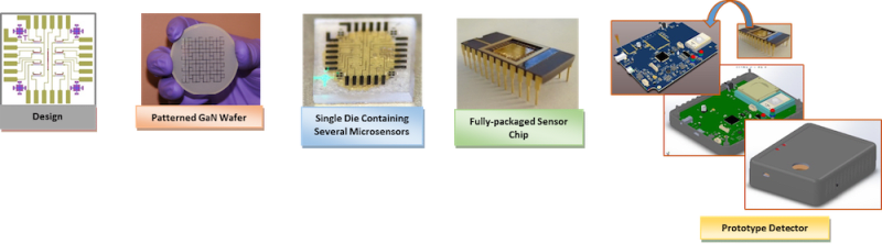 N5 Sensors was incorporated in the state of Maryland with current operation based in Rockville. In the past two years our company has added five full time employees, and will continue to bring more jobs to the county both directly and indirectly by fostering collaboration with state and county agencies and increasing manufacturing operations. Each microsensor is designed to detect a specific target gas, using our patent-pending innovation in photo-enabled sensing - which combines the selective adsorption properties of multicomponent photocatalytic nanoclusters together with the sensitive transduction capability of microscale photoconductors of semiconducting gallium nitride (GaN). , the sensitivity of the microsensors are tailored by the component of surface functionalization, which typically is either a metal-oxide, metal-oxide with metal, or a metal-oxide/metal-oxide combination. These sensors work at room-temperature using only a low-power, low-cost commercial UV light-emitting diode (LED). The highly-selective metal-oxide coating gives rise to the exceptional selectivity of these sensors. Adsorption of target molecule on these nanoclusters results in significant modulation of the photocurrent flowing through these microresistors, resulting in rapid real-time electronic detection. Our nanoengineered surface modification is unique compared to traditional commercially-available metal-oxide sensors, as those need to be heated.