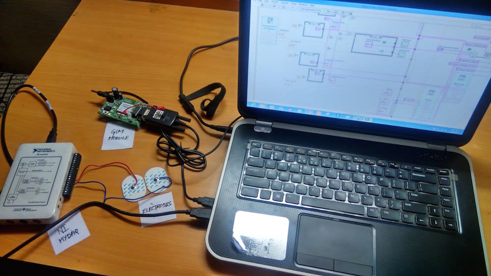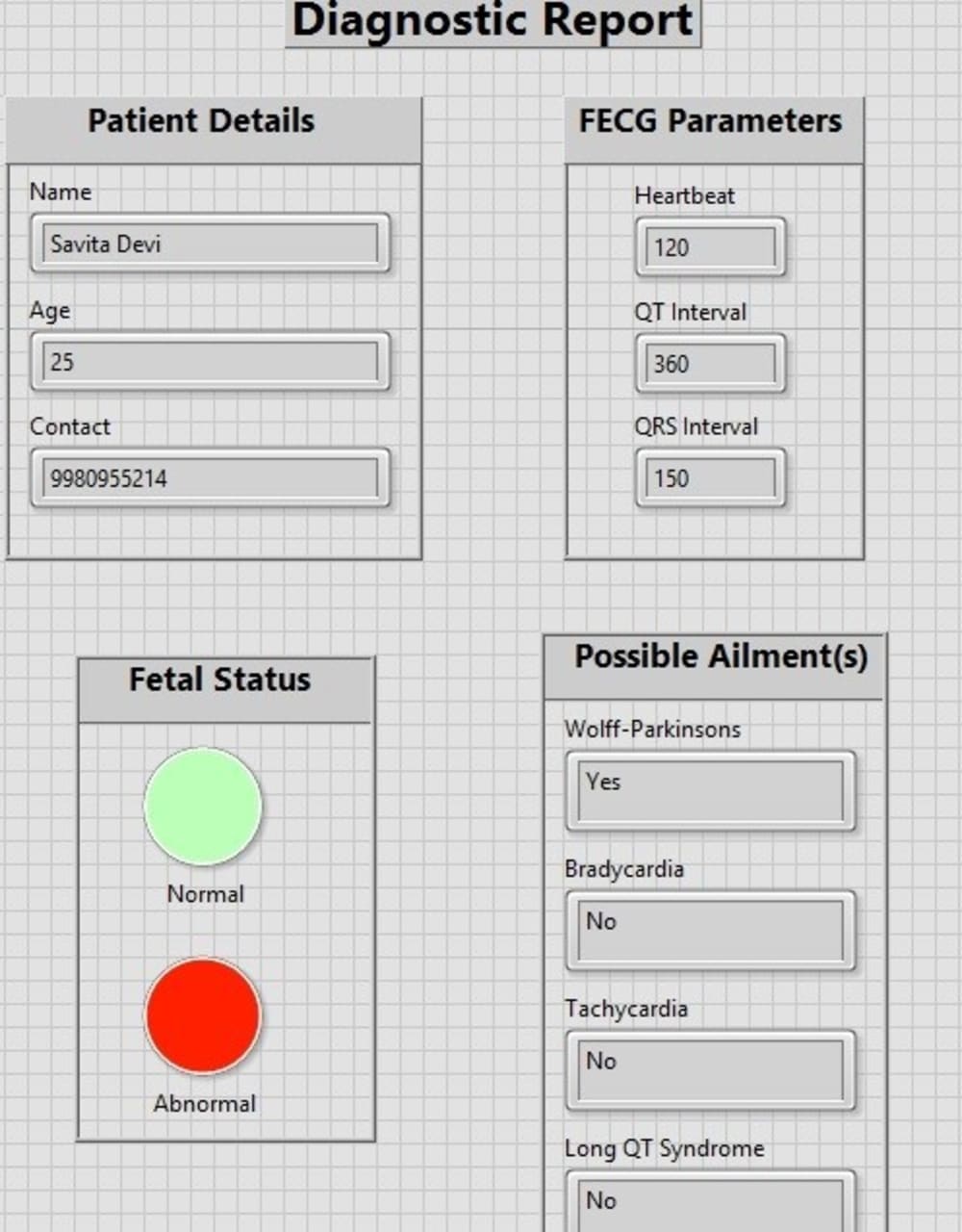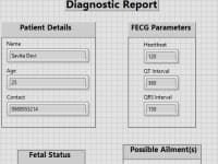 In our proposed system, abdominal surface electrodes are being used to acquire the FECG. This is achieved by placing the electrodes on the abdomen of the pregnant woman The abdominal ECG (AECG) consists of the convoluted mixture of Maternal ECG (MECG) and Fetal ECG (FECG) which is separated from a .lvm file saved from Physionet database. Here in the .vi file, the entire process is systematically segmented through the LabVIEW Event Structure.The next step is to filter the ECG signals for the different kinds of noises. Among them, baseline wandering and powerline interference are the most significant ones. In our approach, we are using the adaptive LMS filter noise filtering and improved detection of the QRS complex.They use a gradient descent method in which the filter coefficients are constantly updated based on the instantaneous error signal. Based on this, a filter length of 40 and step size of 0.45 is created from which the filtered ECG signals are produced for further analysis of the QRS complex. The filtered FECG waveform is then converted into a .tdms file for feature extraction using LabVIEW Biomedical Toolkit. It analyzes the FECG and produces features such as QRS amplitude, QRS width, ST level, PR interval, QT interval and heart rate. Based on these parameters diseases such as Long QT, Bradycardia, Tachycardia, Wolff Parkinsons disease can be detected. The email VI uses .NET connectivity tools of NI LabView to set up SMTP client server access using telnet services of the system with port 587 and and SSL encryption standard. For generating SMS we have used GSM module to interface with NI LabView using a RS232-USB connector and NI VISA serial resources. Though this system is in a simulation stage now it can be used as a product using any NI Analog DAQ input module.