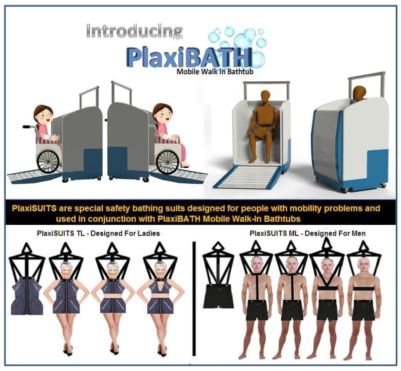 PlaxiBATH are mobile bathtubs designed with many built in facilities specifically for the convenience and safety of handicaps and elderly. This invention aids independent living & allows the user to take care of their personal needs without outside assistance. It is designed as a collapsible moveable bathtub that is transferable from one location to another, without the need to be permanently installed in a standard bathroom, which generally is stymied by limited space. The front panel of the bathing apparatus is configured with a drawbridge to step into the upper body arranged with rough surface. Instead of having to step over a threshold or a tub wall the user just walk straight into the bathtub through the draw-bridge and use his hands to switch on/off a switch which is dangled just above his head to enable a motor to pull up the door so that water can be filled up to the level he wanted.