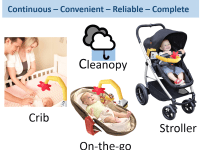 Cleanopy is a mobile air purifier for young children for use in baby cribs and strollers, and provides comprehensive protection against airborne pollutants (particulate matter, NOx, CO and organic compounds). Cleanopy has three major components: clean air generating system (CAG), clean air distribution system (CAD) and clean air control system (CAC). CAG system, comprising of air filter pack and fan, reliably generates clean air. CAD system is connected to CAG system and is used for conducting and directing the air flow. Cleanopy has a proprietary air curtain technology which forms a virtual canopy to keep pure air in and polluted air out. CAC system consists of a combination of sensors for monitoring air before and after filtration and notifying the user when filter needs to be replaced or cleaned. In addition, the sensors form a feedback loop along with the processor regulating air flow and providing smart adaptive filtration. Energy for Cleanopy is provided by rechargeable batteries and can be harvested from the solar panels and rotation of stroller wheels.
