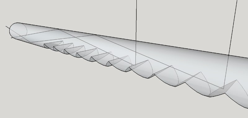 The solar collector is basically a clear rod with grooves cut in the bottom that are made reflective. The cylindrical shape of the rod concentrated the sunlight onto the grooves that directs the light up the rod into the house. The light inside is pointed with a reflector that can rotate to shine the light in any direction. The reflector inside is a disk with a pattern cut through so that when the light falls on the disk the pattern on the backside glows.