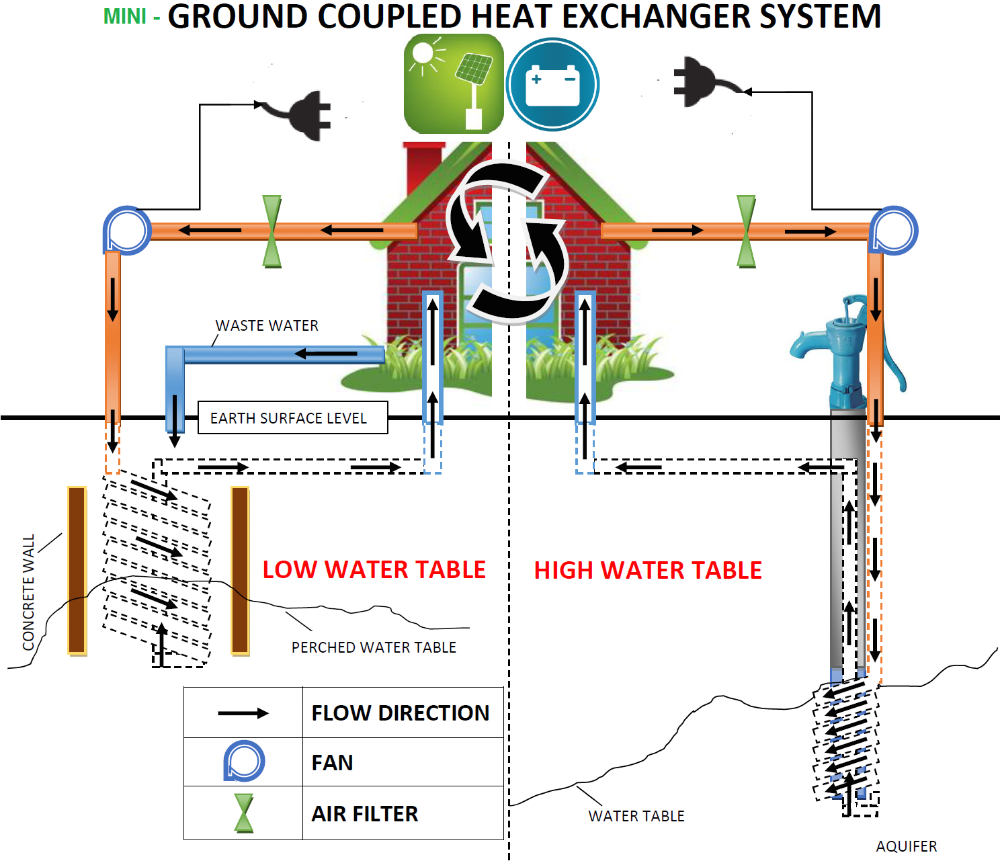Perched water commonly forms on hillsides in the regional low water table and spring to the regional water table. In such region, ground heat exchanger installed in sufficient depth and building wastewater drained to the system. Wastewater protects the surrounding soil temperature from solar radiation and support ground temperature lower than ambient temperature. This low depth ground exchange is completely reasonable for the only cooling mode. Simply, the regions with high water table offer both cooling and heating modes. Here, seasonally aquifer temperature responds opposite to outside ambient temperature by which room temperature naturally auto mode; gives thermal comfort. The spiral ground heat exchanger are systematically placed over the pump suction filter rear end. As room air travels through the ground coupled heat exchange system, it continuously gives up or receives some of its heat to/from the surrounding ground temperature. The room air return through inside the pump suction pipe were aquifer water stored up in the earth surface level. Since, the closed loop system returns and re-return the same air through the aquifer, slim down the room air temperature and ultimately equal to the ground temperature.