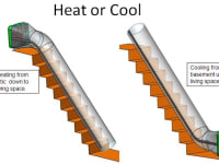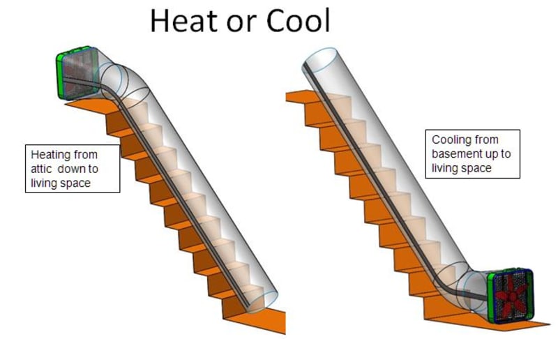 For the cost of running a box fan, people can cool their house in the summer with basement air that is geothermal cooled. People can use the same box fan in the spring and fall to warm their house with hot air that is passively solar heated from their attic. The use of this system can reduce or eliminate heating and cooling bills by 2 to 4 months (20%) per year.