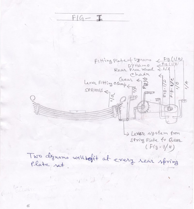 Four dynamo/electric generators will fit besides two sets of rear spring plate/pati and it rotation by by-cycle system’s rear free wheel (fig-1/c). Rear free wheel of by -cycle is rotation by chain which will be fit with gear of by-cycle (fig-1/e) and it (gear) will rotation by liver system which will fit with spring plate (fig-1/h). When the passenger load bus run in speed then the back position is up-down and the liver does rotate the gear and the gear does rotate rear free wheel by chain and rear free wheel does rotate the dynamo. Thus we get electrical energy from four dynamo by this process and the electric is stored in battery which supply energy to engine for running. Thus the bus run without helping of out-source energy. If the bus is ten wheeler, then eight dynamos will be fit. This system is not a barrier to speed or does not lose energy produced by the engine.