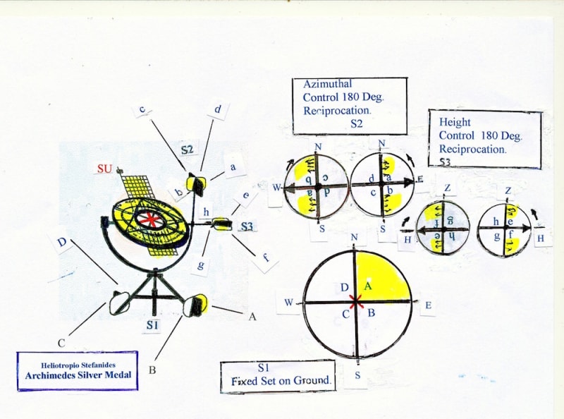 The concept is based on the idea of combining a signal indicating the direction of the radiating Source Rays, within Solid Angles of “Quarter Hemisphere” A, B, C, D [ Set S1-Ground “Fixed”], with a signal received from Angles a, b, c, d [ Set S2-Movable] defining the relative angular displacement of the Tracker’s Orientation [ AZIMUTHALLY] from these Rays’ Direction.