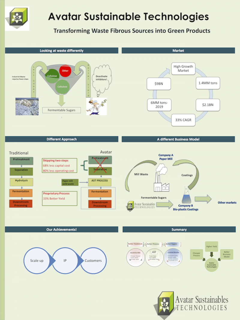 Avatar Sustainable Technologies' mission is to convert waste from recycled paper mills into high value biomaterials. The recycled paper industry has seen rapid explosive growth in the last decade, driven by the shift in consumer shopping from store-centric to online and thus an increased demand for shipping of products. Most recycled paper facilities in the USA are outdated, and only recently new manufacturing technologies have been adopted; indeed, 90% of the country’s 150 paper mills are more than 10 years old. These facilities have large production capacities that produce copious amounts of solid waste due to old and inefficient technology. Therefore, a preferred option is to reject these as solid waste, and thus some paper mills are spending $1.5 to $2 million each year to have them sent to landfill.