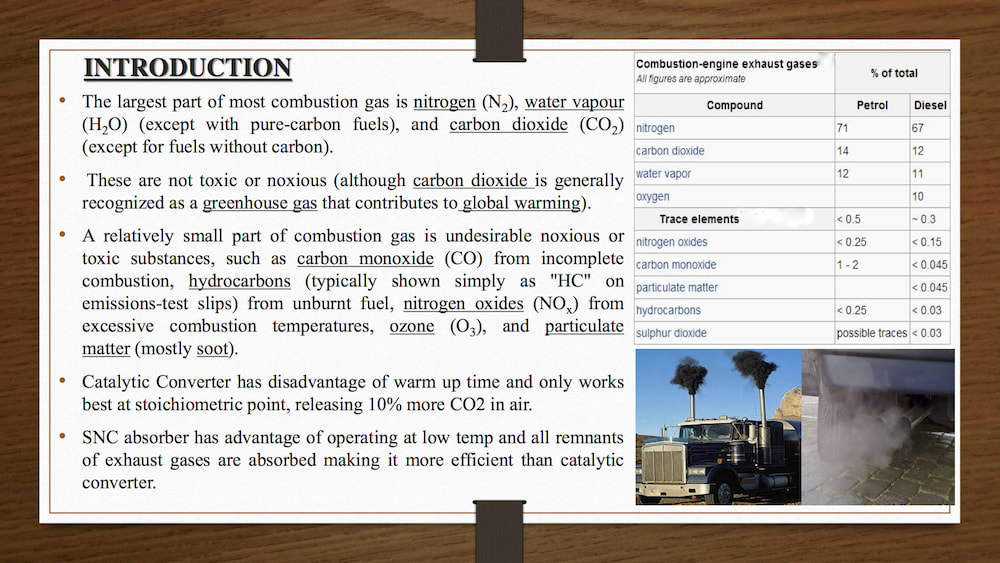 SNC Absorber is an abbreviation of Sulphur dioxide, Nitrous oxide and Carbon dioxide Absorber. The problem of pollution through automobiles being a major concern for today’s world has lead a dire need of solution to minimize air pollution as much as possible. The major contents of outlet of an engine exhaust of gasoline engine are Carbon Dioxide (CO2), Nitrogen (N2) and Water Vapours. Also, Traces of Carbon Monoxide (CO), Sulphur Dioxide (SO2), Nitrogen Oxides (NxOy) along with some Hydrocarbons and particulate soot. Such gases are responsible for global warming and many other environment damage.
