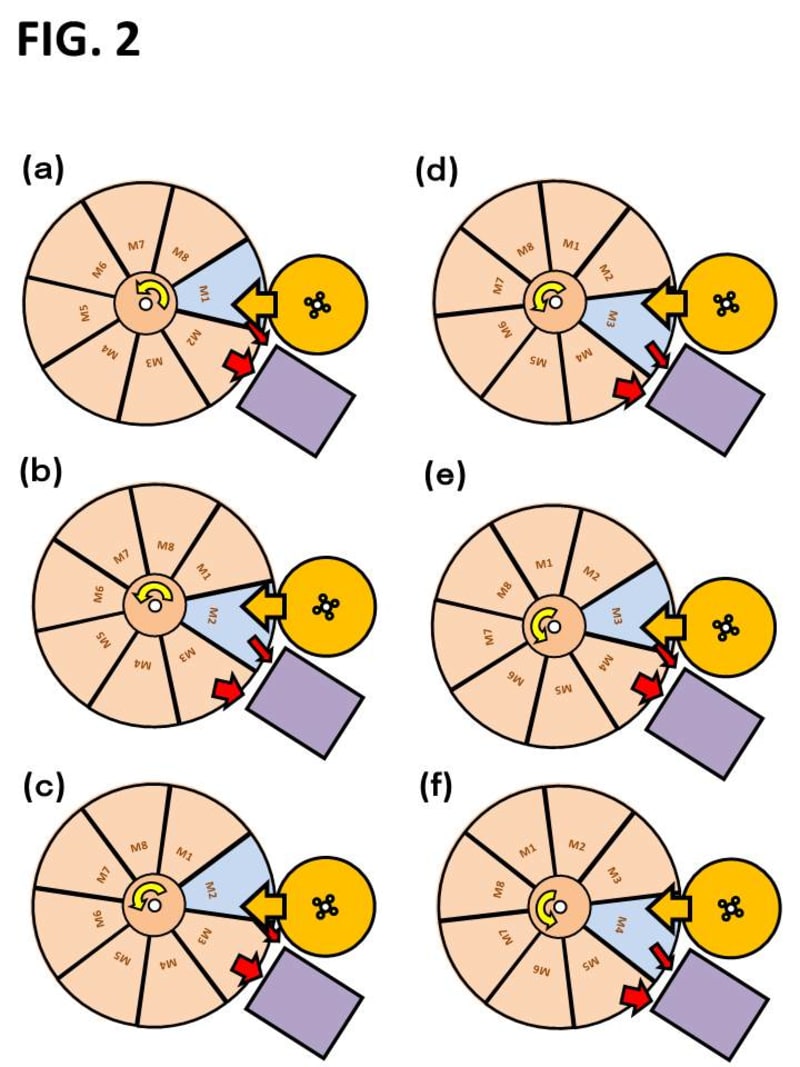 Wheel rotation swaps the position of the magnetostrictive materials M1 and M2 as shown in Figure 2(a)-(b). Accordingly, the pressure is applied to the magnetostrictive material M2. The property that is attracted to the magnet of the material M2 is weakened. Another magnetostrictive material M3 is strongly attracted to the magnet. The wheel rotates continuously as shown in Figure 2(c)-(f). Repeat the same motion, the wheel will continue to rotate.