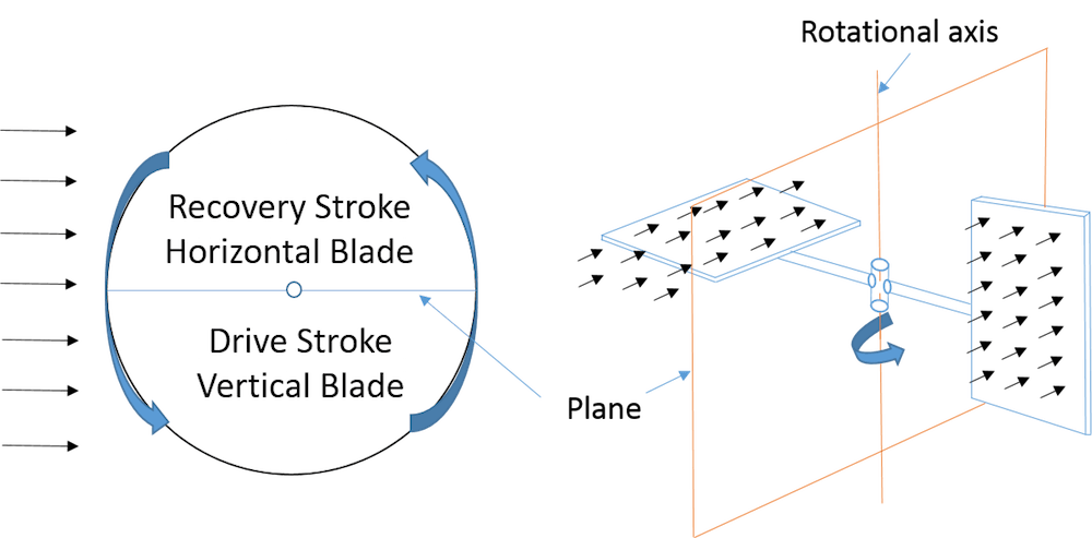 In both the above cases, controlled variation in the effective area of an oar blade or wing from one stroke to another is improving their efficiency. This principle can also be used to capture energy from a fluid flow. A similar principle is observed in some drag based Savonius VAWT, where the shape of the blades creates a difference in the up stream and down stream drags resulting in a net torque on the turbine.