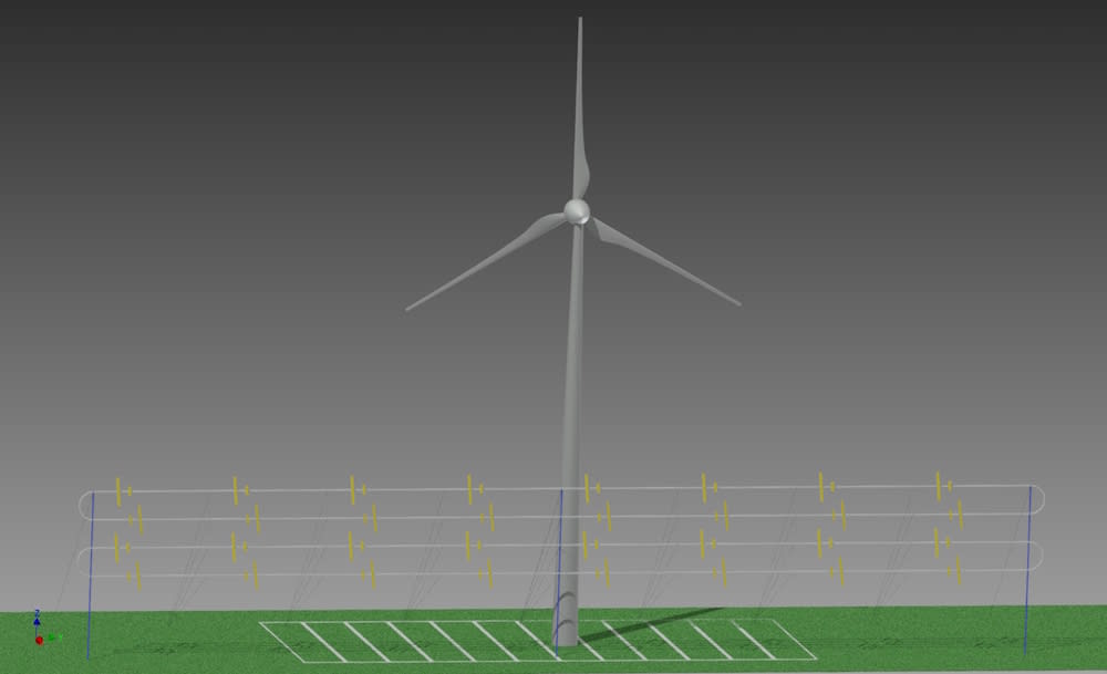 Although the AirLoom doesn’t look much like a HAWT, it uses the same aerodynamics. It captures energy through translational rather than rotational motion in the tips of the airfoils as they run along a rail tethered by bridles. The small airfoils behave exactly like the outer tips of a HAWT airfoil, which are the components that do all the work in a HAWT. The patented bridling system handles downwind forces (aerodynamic “tip-over” forces), which are the primary cause of the HAWT’s mass and cost. The bridles tether the oval track to the ground, absorbing the forces as the airfoils travel around the track. Because the forces are distributed rather than concentrated—and because they are handled by components in tension (cheap, light) rather than compression (expensive, heavy)—each bridle can be small, lightweight, and inexpensive.