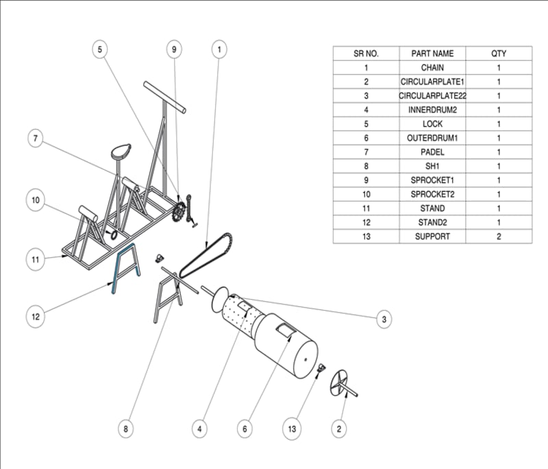It is easy to manufacture. This machine requires an inner drum and outer drum which are available in plastic material. It requires two padestral bearings, two gaskets and around 35ft square pipe, 1 chain sprocket which can be used on a bicycle etc.