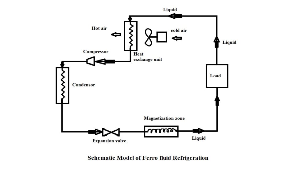 This Kit consists of Ferrofluid, pump, Fan, expansion valve, PZT mount and housing unit. When an external magnetic field imposed on a ferrofluid with varying susceptibility (e.g., because of a temperature gradient) results in a non-uniform magnetic body force, which leads to a form of heat transfer called thermomagnetic convection. This form of heat transfer can be useful when conventional convection heat transfer is inadequate. There is much potential for the use of ferrofluids in a variety of modern applications as the understanding of their flow characteristics becomes more widely known. Utilizing an applied external magnetic field, ferrofluid movement can be controlled. This leads to great potential for their use as the working fluid in Refrigerators. A ferrofluid refrigerator could reduce manufacturing costs as it requires no wicking structure, and the effective thermal conductivity of the refrigerators could be increased by increasing the liquid flow rates within the heat pipe due to the added magnetic pressure difference.