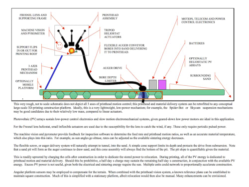 A low-cost, self-sustaining, solar-powered system is proposed, which automates large-scale 3D printing of roads and other structures, transforming sand, in situ,