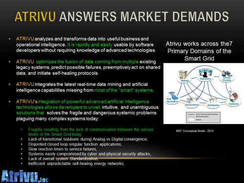 Atrivu Synthetic Intelligence SmartGrid Solution (ASISGS) truly brings smarts via cognition to our nation's and the world power grids. ASISGS is a cloud-based service that truly provides the smarts for the nation's power grids. The seven domains of the current "smart grid" include bulk generation, transmission, distribution, markets, operations, service provider and customer. All may connect with ASISGS.