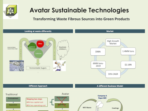 Avatar Sustainable Technologies' mission is to convert waste from recycled paper mills into high value biomaterials. The recycled paper industry has seen rapid explosive growth in the last decade, driven by the shift in consumer shopping from store-centric to online and thus an increased demand for shipping of products. Most recycled paper facilities in the USA are outdated,